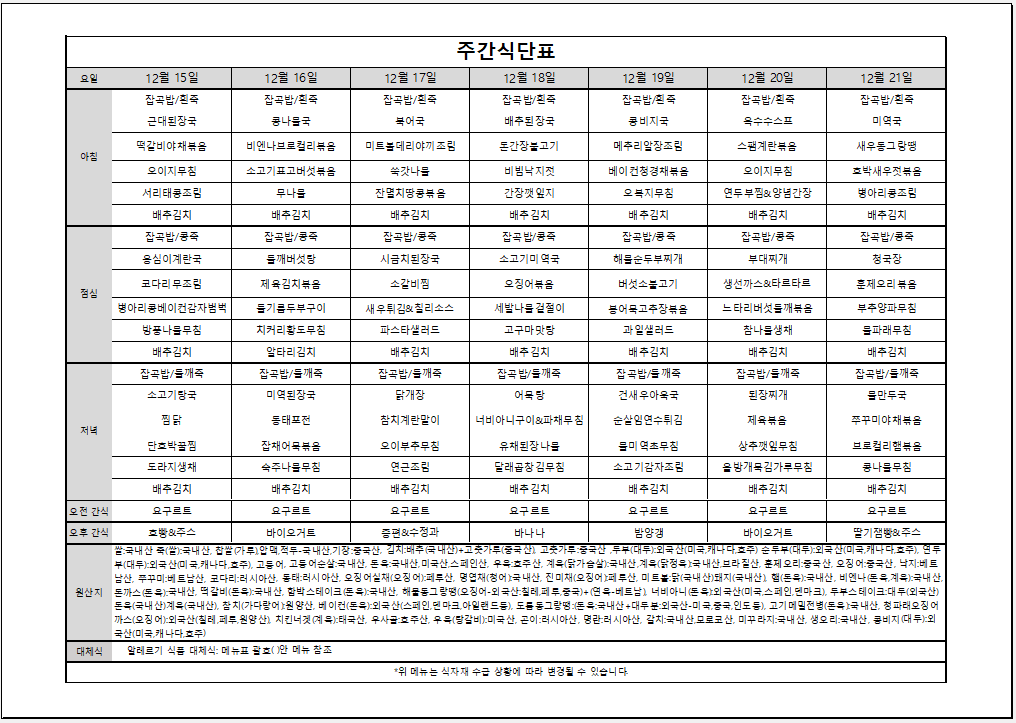 12월 3주 주간식단표입니다