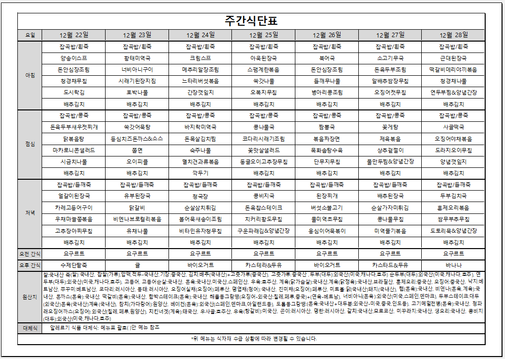 12월 5주 주간식단표입니다