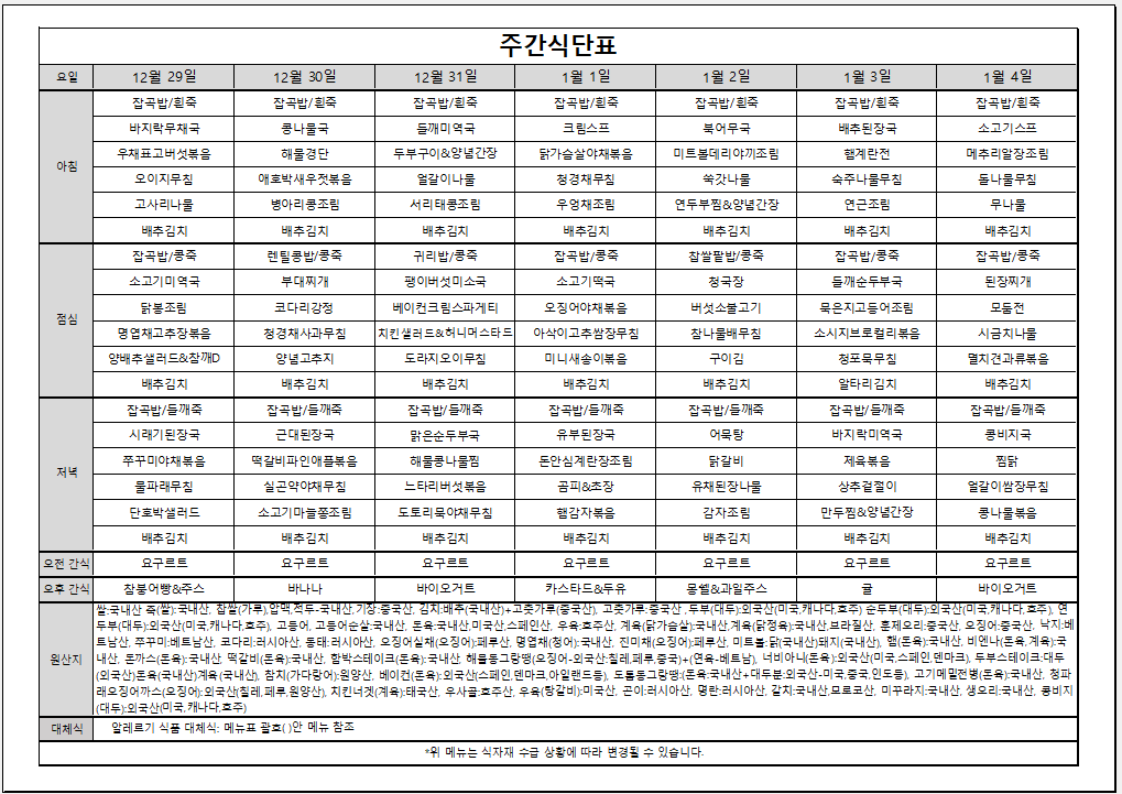 12월 4주 주간식단표입니다