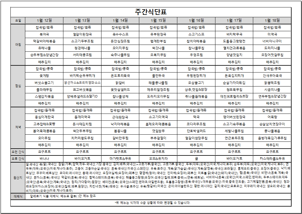1월 3주 주간식단표입니다