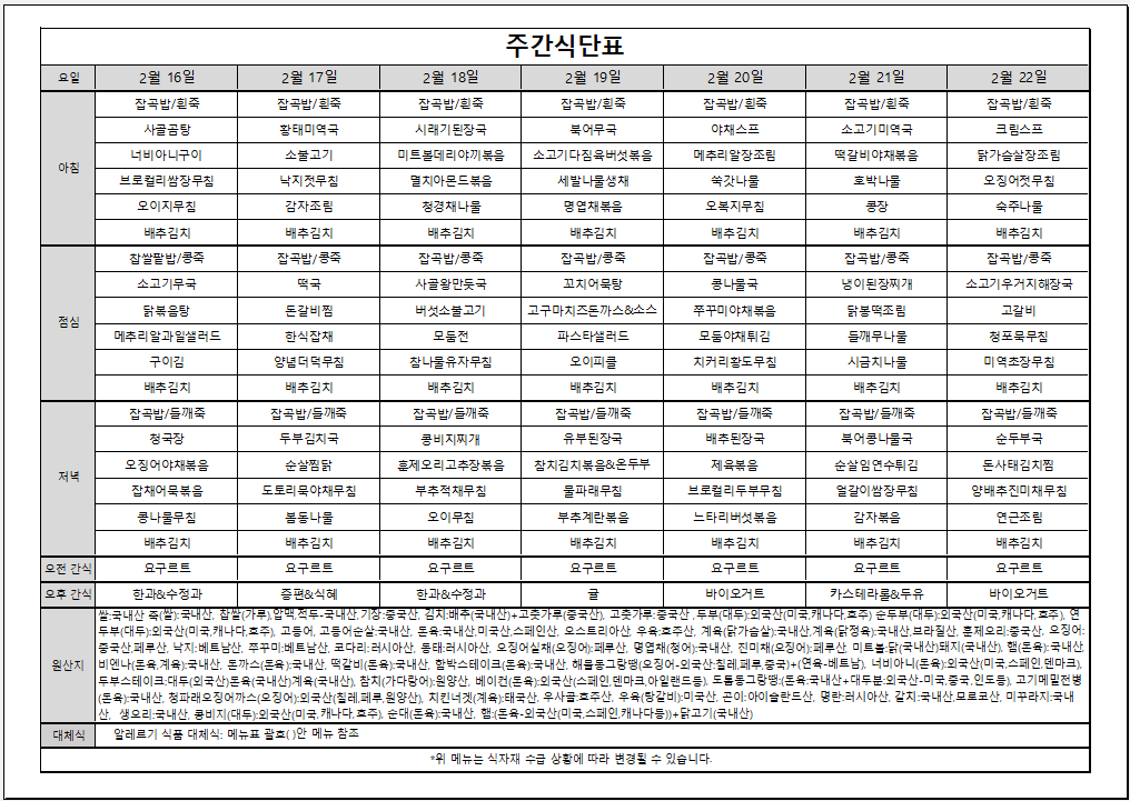 2월 3주 주간식단표입니다