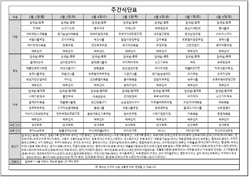 3월 1주 주간식단표입니다
