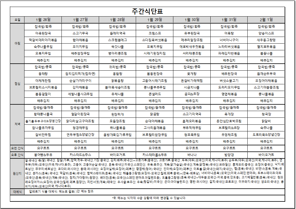 1월 5주 주간식단표입니다
