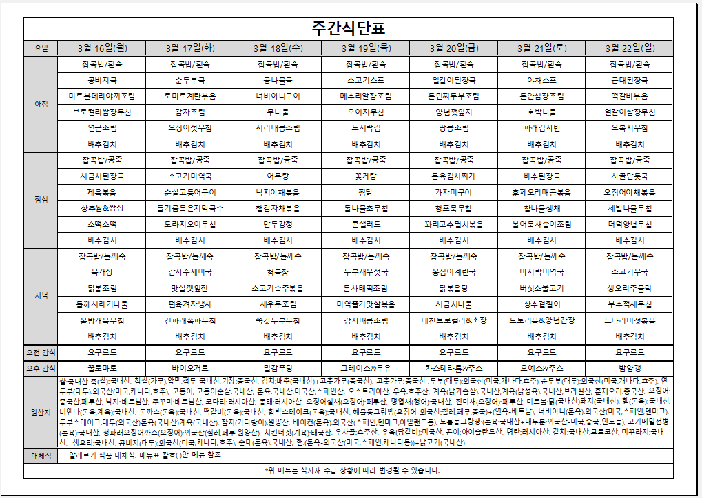 3월 3주 주간식단표입니다